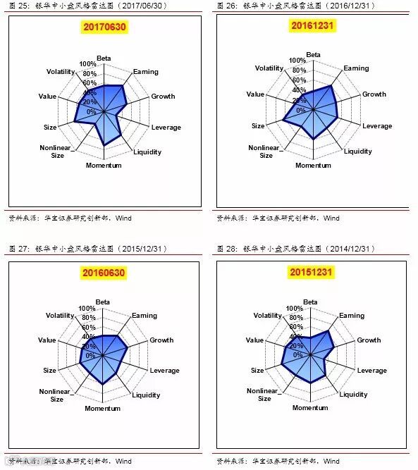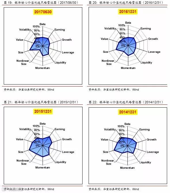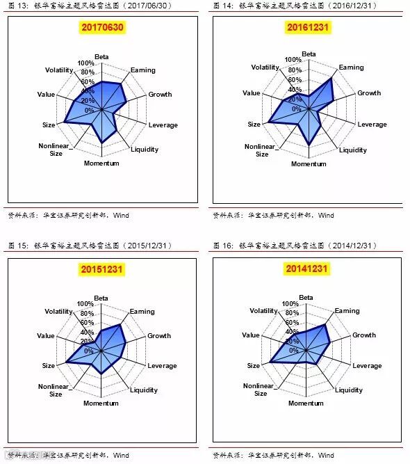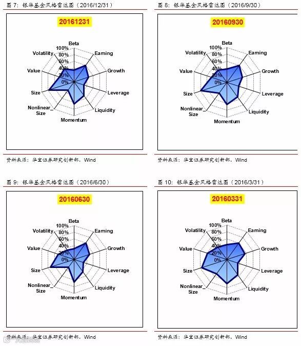 我们把每个季度银华基金前50大重仓股作为一个模拟组合,采用barra模型,对银华基金近两年整体的风格进行判断。从结果上看,在大小盘风格上,稳定维持在大盘风格;在盈利质量上,也始终维持在较高水平,反映出银华在选股上非常重视公司的基本面;在成长性和估值方面,呈现出明显的同向变化,反映出银华在挑选成长股时,会关注公司的估值水平,只在合理的估值范围内挑选成长好的企业;在动量、反转因子上,动量效应更明显,表现出银华更偏好趋势投资,购买处于上涨通道上的股票;在流动性因子(换手率)的暴露水平则不太稳定,一方面可能是因为大盘股流动性本来就较好,另一方面说明银华并不热衷于追逐市场热点。