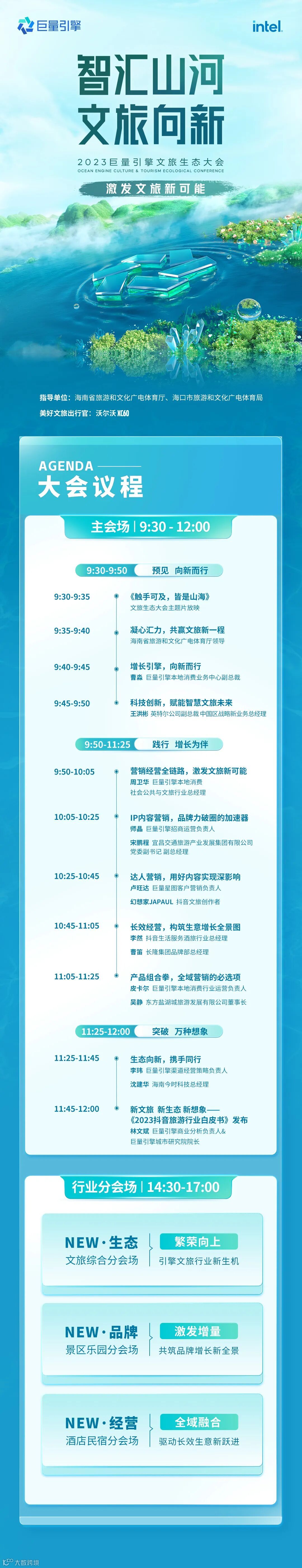 在此次大会上,巨量引擎联合文旅生态伙伴一起从全局视角出发,给出文旅发展新探索。来自海南省旅游和文化广电体育厅、巨量引擎本地消费业务中心、英特尔的嘉宾代表,将分别就如何打造城市文旅名片带动消费提振、巨量引擎如何助力文旅生意经营、科技创新如何赋能智慧文旅等主题,分享前沿观点和洞察。