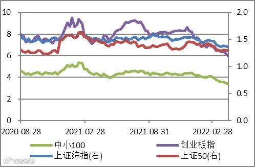 投资策略上,一是积极跟踪重要行业的拐点。当前疫情防控和通胀上行对部分行业景气度造成影响,绝大多数并非长期趋势的变化。对于这些行业如食品饮料、农林牧渔,我们保持高频跟踪,若基本面拐点确立,或有较大收益空间。二是长线布局可穿越经济周期的成长主线,如医药、信创、军工等。近期市场调整过程中,成长板块的高估值问题有所缓解,中长期价值开始稳步提升。此外,适当防御,在“稳增长”和“顺通胀”的高景气度板块如光伏风电、数字基建、煤炭等方向均衡配置。