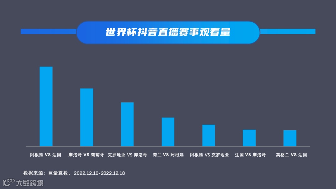 从观赛数据来看,进入1/4决赛后,通过抖音体育账号观看世界杯直播的用户继续增加,看播量也继续升温并维持高位,尤其阿根廷队和法国队的决赛,用户看播量暴增,也创下本届世界杯单场看播量的记录。