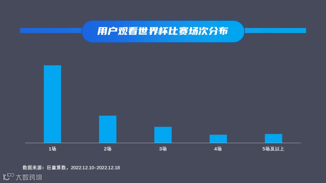 本周赛事安排较为紧密,且精彩程度逐渐提升。根据巨量算数数据统计,从用户观看世界杯比赛场次分布来看,在8场比赛中,观看过1场比赛的用户达到56%,观看2场比赛的用户占比近20%,观看过5场及以上比赛的用户占比超过6.6%。