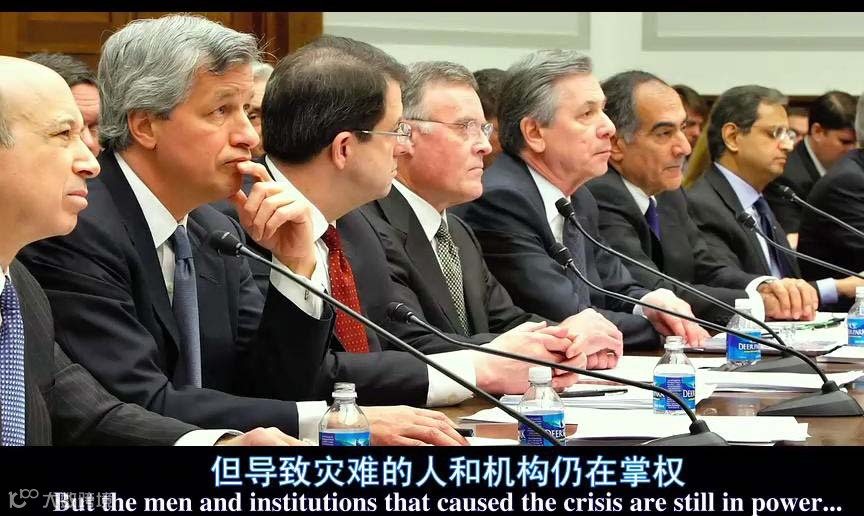 金融危机之后,如何避免下一次?美国人自己也在反思。冷战之后美国人面临25亿劳动力的竞争,导致制造业衰退而其他产业崛起,同时贫富差距拉大,财富主要集中在 1% 的人手里。普通的美国人要么是加班加点,要么负债累累。中产阶级衰败后,政策需要应对,于是开始降低房贷标准。因此次贷背后其实就是选票。尽管奥巴马上台后,声称要对金融业改革,结果一看,奥巴马身边搞经济的人,全是这帮金融危机制造者,不少还来自投行。IT IS A WALL STREET GOVERNMENT ! 相比欧洲通过法案专门对银行高管薪酬进行监管,美国没有任何一位金融高管被刑事起诉,没有任何一家公司因证券欺诈被刑事起诉(限于片子拍摄时)。看起来,这个问题其实是无解的。哎,底层的民众,永远都在金融圈食物链的低端。