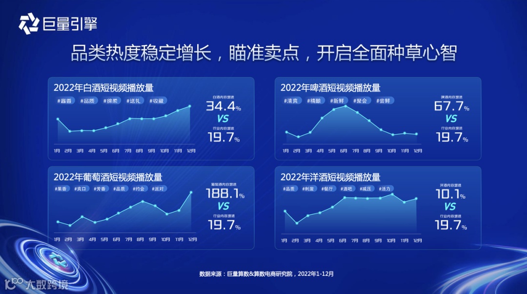 来自巨量算数&算数电商研究院一季度的数据,近 90 天对酒水相关内容有多次观看、互动、搜索等行为人群,抖音和今日头条全平台超过 3 亿,人群圈层进一步扩大。在受众扩大的同时,是内容提供者的显著增长。2022 年和 2021 年的数据对比显示,抖音酒水达人数量、抖音酒水企业号数量、抖音酒水作者活跃度都是两位数增长,其中抖音酒水企业号数量同比增长 40%,显示出酒水内容生态非常活跃。品类热度上看,葡萄酒增幅最大,为 188.1%,啤酒和白酒紧随其后,分别为 67.7% 和 34.4%。