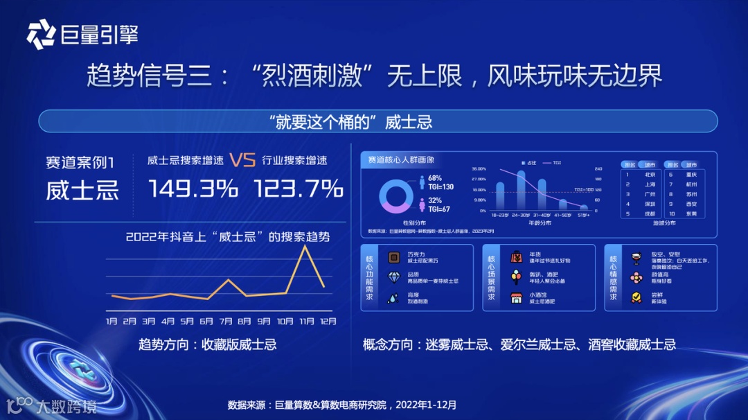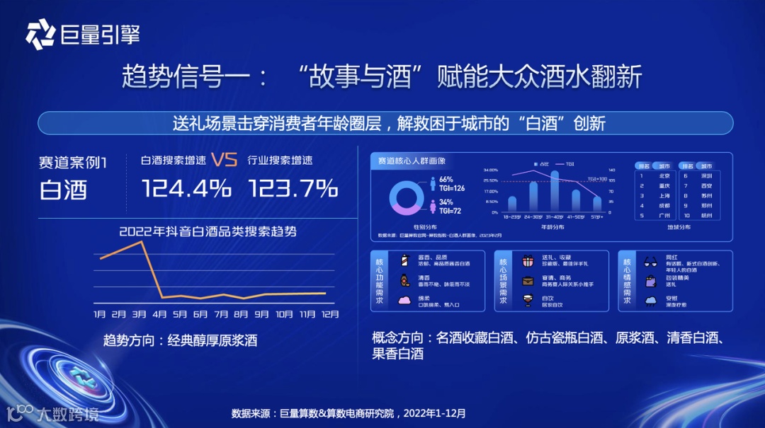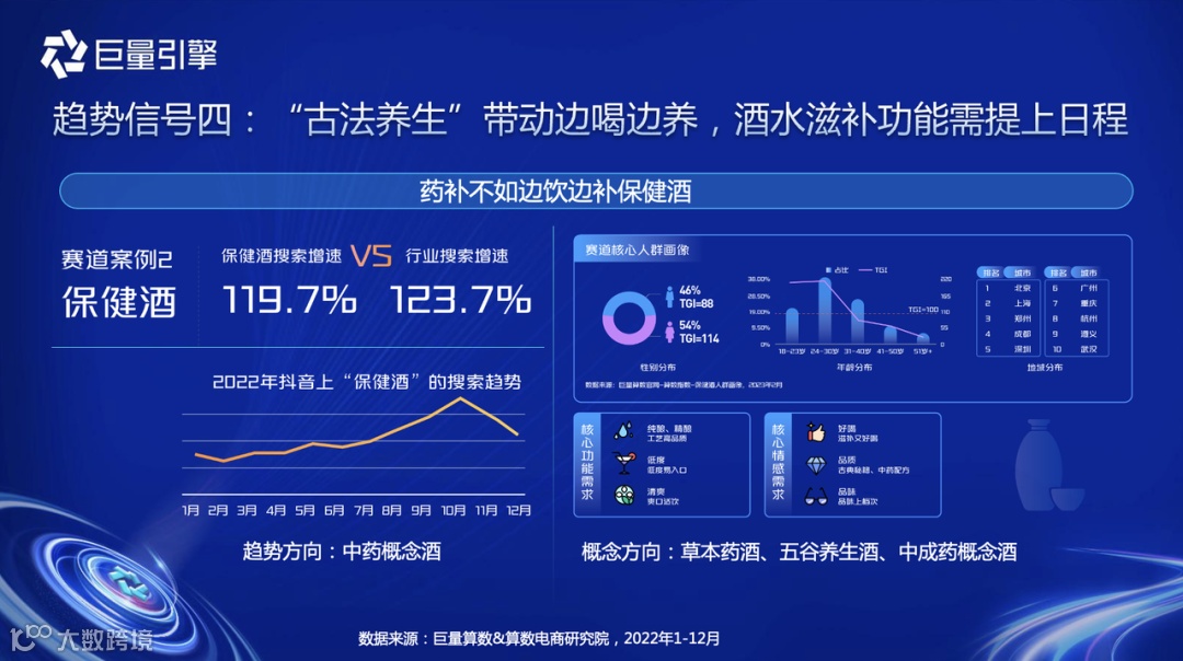 烈酒刺激显示出威士忌等洋酒逐渐受到关注,体现出非常强烈的男性风格。以威士忌为例,搜索增速持续在上涨,而且是跑赢了行业大盘。目标受众是一线的年轻男士,功能诉求非常具体,高品质、高度数。预测这一品类未来的方向会是在收藏版威士忌,或者是定制型,能够满足年轻人高品质饮酒的一些诉求。古法养生的趋势,来自于保健酒在抖音搜索量的大幅增长,保健酒群体中 24 至 30 岁占比最高,女性用户会更多一些,城市分布在新一线和一线的城市。预测草本药酒,五谷养生酒,中成药概念酒等方向,虽然小众但是有潜力。