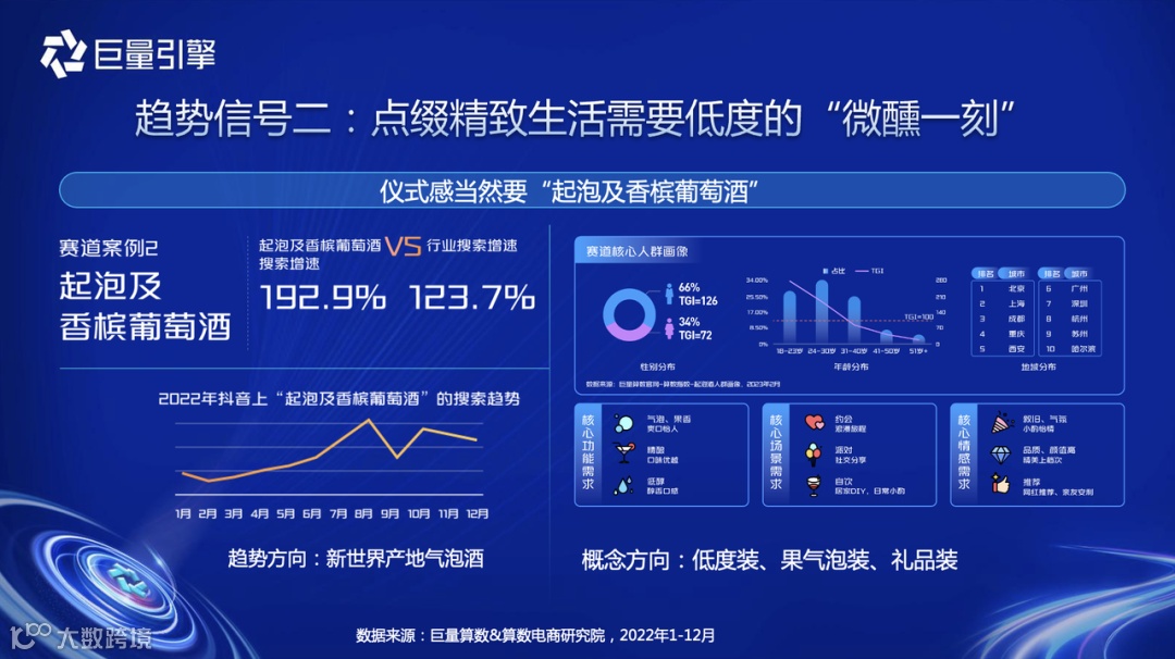 2023 年酒水赛道的新机会在哪?巨量算数去年研发了趋势赛道方法论,核心是帮助品牌找到趋势的风向,把有突破性增长的消费赛道挖掘出来。江倩分享了酒业的四个比较关键的趋势信号:故事与酒、微醺一刻、烈酒刺激和古法养生。
