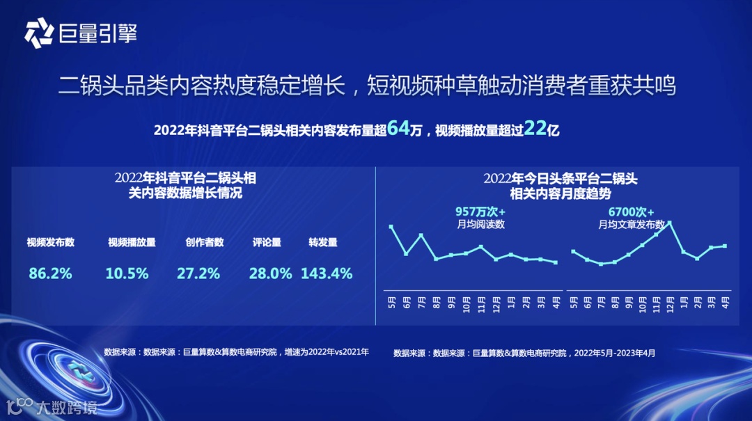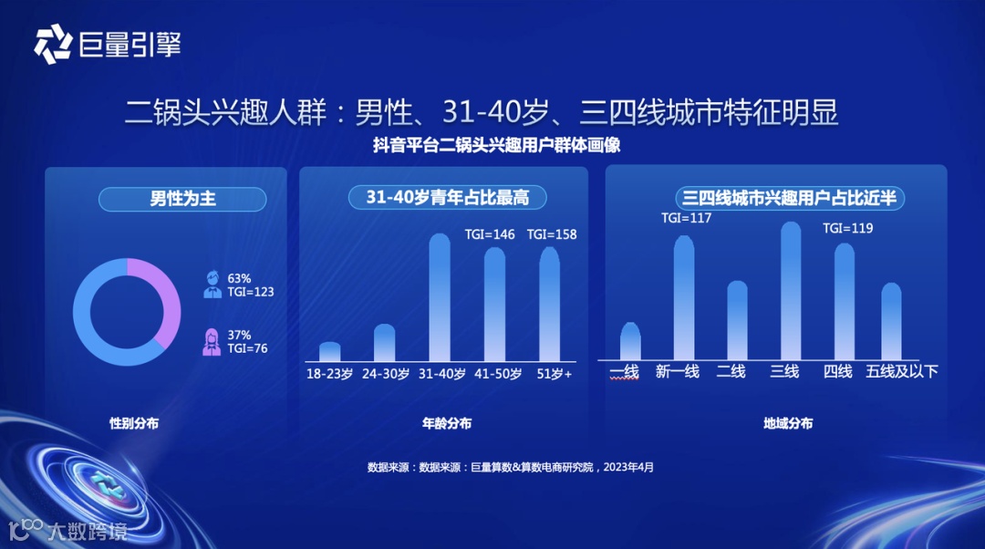 其中,二锅头是北京的一张名片,数据显示二锅头品类内容热度稳步增长,2022 年抖音平台二锅头相关内容发布量超 64 万,视频播放量超过 22 亿。关注的人群中,男性占 63%,女性占 37%,以 31 岁到 40 岁的青年群体占比最高。除了一线和新一线城市外,三四线城市的兴趣用户占比近半。