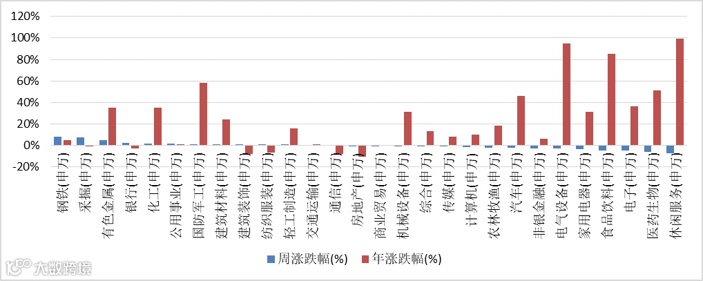 上周恒生指数周跌0.4%。行业指数方面,恒生原材料业(+8.48%)、能源业(+6.91%)、公用事业(+2.89%)涨幅居前,恒生医疗保健业(-4.74%)、资讯科技业(-3.69%)、工业(-2.76%)跌幅居前。