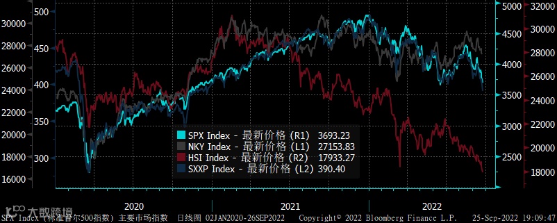上周标普500周跌4.65%,欧洲斯托克600周跌4.37%,日经指数周跌1.50%。