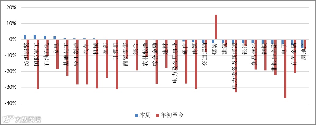 恒生指数周跌5.16%。行业方面整体收跌,恒生医疗保健业(-11.81%)、资讯科技业(-8.86%)、原材料业(-8.27%)跌幅居前。