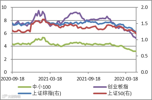 上周沪深只有两个交易日,市场主要还是在消化五一节期间国内外的变化。内部方面,长三角地区新增确诊人数已呈现趋势性下降,其他地区疫情亦未出现爆发,重点行业有序复工复产。虽然二季度部分行业受到的影响确实不小,但已能看见走出疫情的曙光。在政策有望加大发力支持的背景下,经济底的预期在逐步清晰。另一方面,外部环境更加复杂。高通胀下各国货币政策步入紧缩周期,美国FOMC会议(美联储议息会议)如期加息50个基点、英国央行年内第四次加息。受此影响,人民币周内面临一定贬值压力。俄乌方面,双方就亚速钢铁厂的争夺陷入焦灼。因此,对全球投资者来讲当前大环境仍缺乏确定性,短期看风险偏好恢复有限。当前,考虑到两市估值水位处在历史偏低区间,以及此前调整过程中部分投资者预期已较为悲观,我们认为市场已经从抛售阶段进入磨底期,对后市边际乐观。