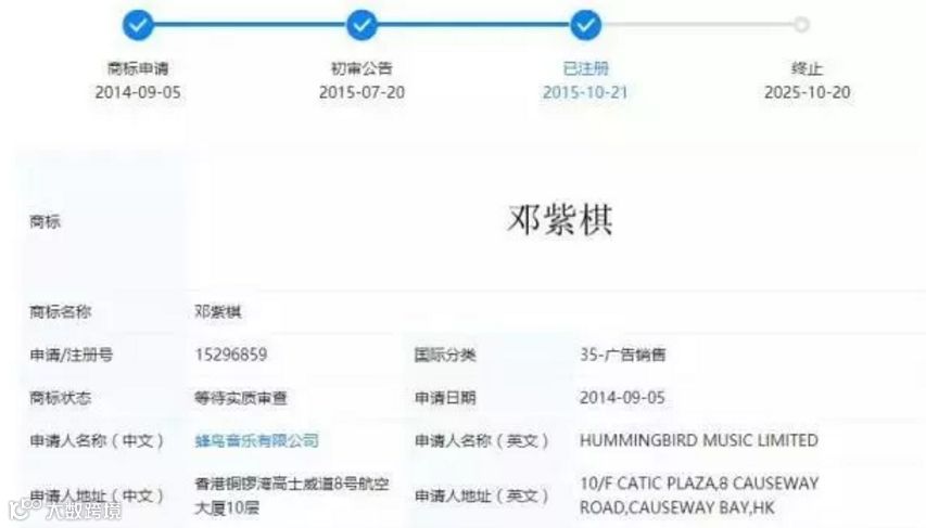 在天眼查中可以看到,蜂鸟音乐有限公司在2014年9月5日申请了“邓紫棋”的商标,2015年7月20日通过初审,在2015年10月21日进行注册公告,有效期10年。