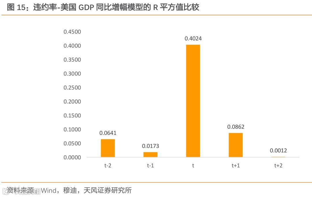 为了检验违约率与GDP增速变动的前后关系,我们对1987年后的违约率与美国GDP增速做了简单的线性回归。进行回归时,我们分别将当期(t)违约率与当期(t)、置后一期(t-1)、置后二期(t-2)、前置一期(t+1)、前置二期(t+2)的美国GDP同比增幅做了回归,并比较了所得模型的R平方值。如图15所示,各模型中拟合程度比较好的就是当期违约率与当期美国GDP增幅,该模型的R平方值达到了0.4024,拥有比较好的拟合度。也就是说,违约率的变动同美国GDP增幅变动趋于同步,呈现出即时性的特征,但变动方向相反。