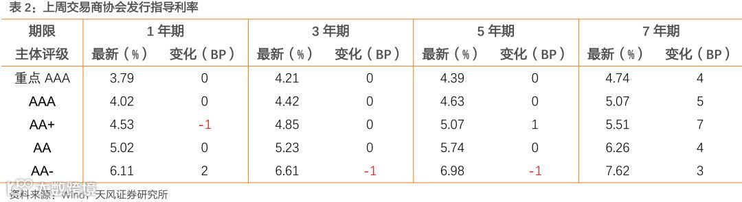 从发行利率来看,交易商协会公布的发行指导利率整体下行,各等级变动幅度在-1-7BP。具体来看,1年期各等级变动-1-2BP;3年期各等级变动-1-0BP;5年期各等级变动-1-1BP;7年期各等级变动3-7BP;10年期及以上各等级变动1-6BP。