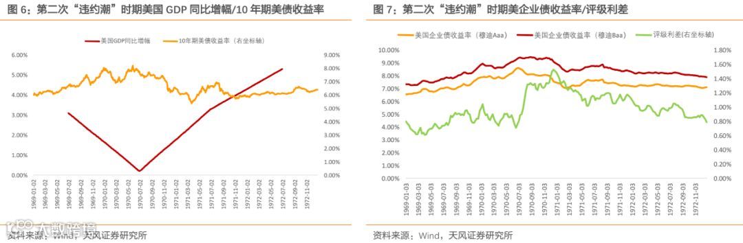 第一次“违约潮”爆发于1931年至1940年间,这一头一尾恰好分别是美国“大萧条”的“鼎盛”时期与二战的爆发。相比其它四次“违约潮”,1931年的“违约潮”来势最为凶猛,在1933年巅峰时违约率曾高达8.33%,超过了之后任一轮“违约潮”的峰值。“大萧条”最先始于1929年10月美国股市崩盘,但真正造成违约率大幅上升却是在1931年。我们认为其原因在于1930年11月后经济危机的影响开始波及到银行业,导致了“大萧条”时期的第一次银行业危机。由于许多银行在“大萧条”时期破产,储户们开始担心起自己在银行中的存款,恐慌性的“挤兑”由此产生。之后的1931年至1933年又相继发生了第二次银行业危机与第三次银行业危机,银行体系流动性大幅减少,社会信用紧缩,加之危机爆发前企业部门所举的大量债务到期,违约率从1931年开始连续三年暴增,评级利差也于此时陡升。1933年后违约率开始回落,但是由于经济基本面迟迟未能好转,违约率在1933年至1939年间仍处于高位。高违约率的情形一直到1940年二战爆发、经济矛盾转移后才最终结束。