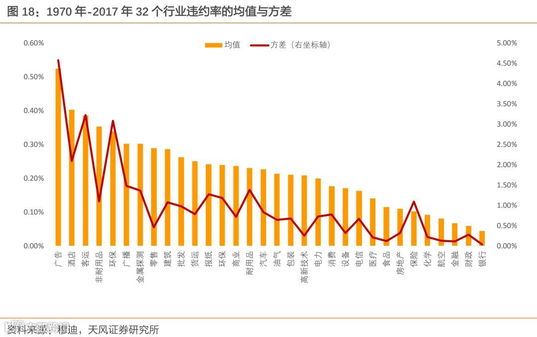 除“集中”这一特征外,各行业的历史违约率还呈现出了“分层”的特征,即不同行业的平均违约率以及违约率的方差相差较大。所有行业中航空、银行、食品、化学、金融、保险与房地产这7个行业的违约率均值低于1.00%,且除保险行业外这些行业的违约率的方差也很小,反映出了对“违约潮”的良好“抗性”。相反,广告、酒店、客运与环保这5个行业不仅有着较高的违约率均值,同时违约率的方差也较大,它们更易受“违约潮”的影响。