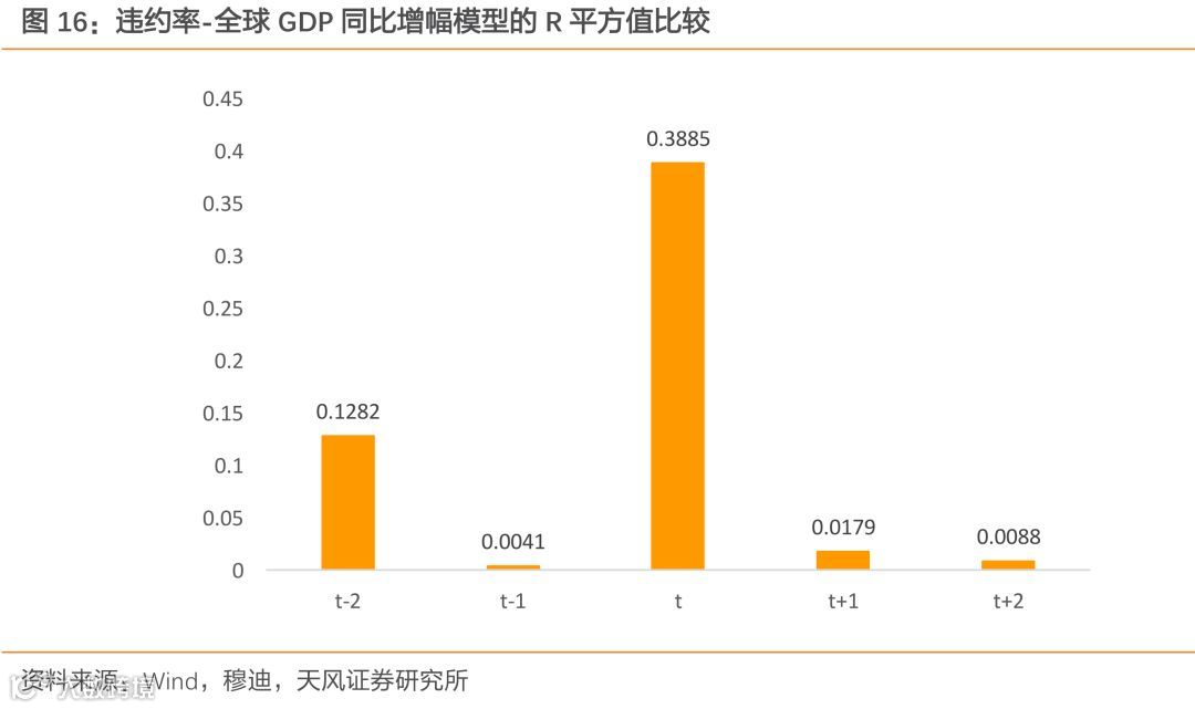 全球GDP的同比增幅与违约率的变动同样呈现出即时的负相关性。我们运用同样的方法将当期(t)违约率与当期(t)、置后一期(t-1)、置后二期(t-2)、前置一期(t+1)、前置二期(t+2)的前期GDP同比增幅做了回归,各模型所得的R平方值如图16所示。同样,当期违约率与当期全球GDP同比增幅的模型是拟合度最高的,该模型的R平方值为0.3885,在该模型下违约率与全球GDP增幅的相关系数为-0.6723。