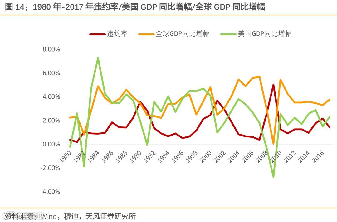 在1987年之后违约率表现出了与美国/全球经济同比增速的强负相关性,且其变动倾向于同GDP增速变动同步,即经济衰退之年违约率往往较高,经济繁荣之年违约率往往较低;