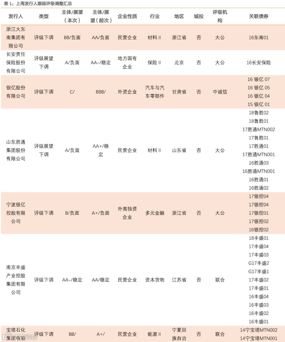 本周9家发行人及其发行债券发生跟踪评级调整,2家上调,7家下调。上周评级一次性下调超过一级的发行主体:浙江大东南集团有限公司、长安责任保险股份有限公司、银亿股份有限公司、山东胜通集团股份有限公司、宁波银亿控股有限公司、宝塔石化集团有限公司。