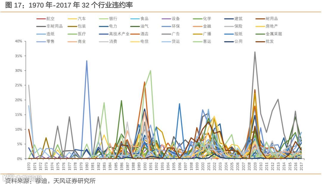在“违约潮”来临时,各行业违约率往往会呈现出“集中式”的上涨,如2008年“违约潮”时,穆迪分类的35个行业中有30个出现了违约,有28个的违约率较前年出现了上升。“违约潮”来临时,出现违约的行业数也会随之出现一个大幅的上升。一般在一轮“违约潮”的顶峰时期,违约的行业也是最多的,如2009年、2001年与1991年这三个“违约潮”的顶峰年,35个行业中分别有多达30、32与24个行业出现违约,而在非“违约潮”时期,平均每年出现违约的行业仅为12个左右。