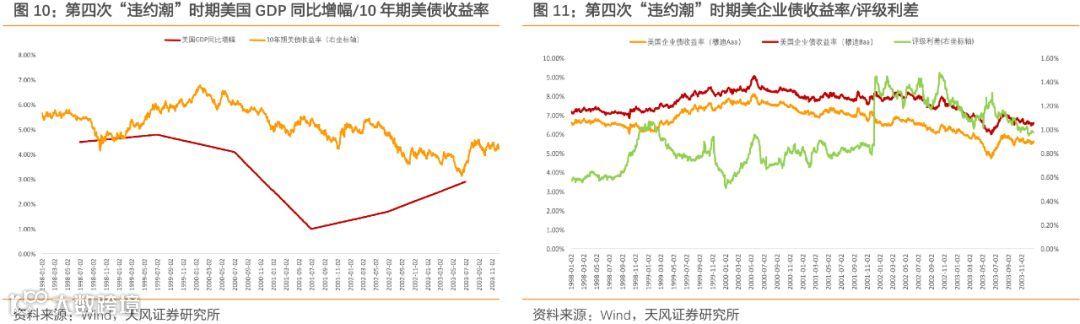 第四次“违约潮”爆发于1999年至2003年,这段时间包含了2000年互联网泡沫的破灭与90年代末亚洲、拉美等多地的经济动荡。该段违约率的上升最初始于1997年,当年金融风暴席卷了多个亚洲国家,亚洲经济增速开始调头下行。到了1998年,亚洲金融危机深化、俄罗斯及拉美经济动荡,全球整体经济环境恶化,违约率也在此时开始走高。当年美国经济增长延续强劲势头,并保持着4%以下的失业率,但经济开始出现过热倾向,其中最明显的特征便是互联网泡沫的持续膨胀。美联储虽然意识到了经济的过热,在1999年6月至2000年5月期间进行了6次加息,但仍未能阻止泡沫的破灭。2000年互联网泡沫破灭后,违约率在2001年至2002年间大幅上涨。