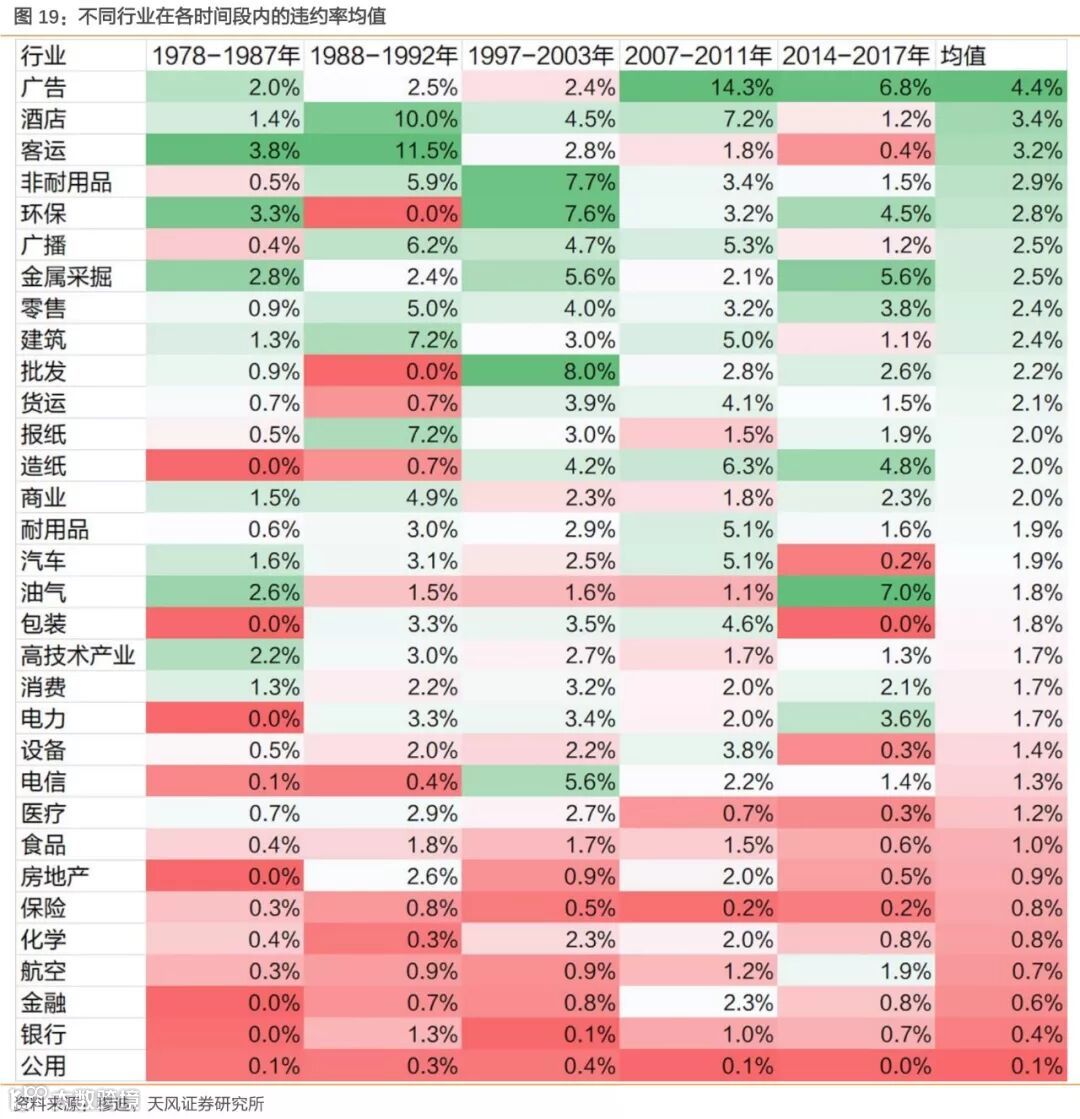 违约率高的行业一般违约率波动更大,而违约率低的行业一般违约率波动更小,这是不同行业在违约率上呈现出的行业特征。由此我们猜想那些历史违约率低的行业受“违约潮”的影响可能也相对那些历史违约率高的行业更小。为验证我们的这一猜想,我们从1970年至2017年间拆分出了1978年-1987年、1988年-1992年、1997年-2003年、2007年-2011年、2014年-2017年几个主要的时期,分别观察这几个时期不同行业的平均违约率。