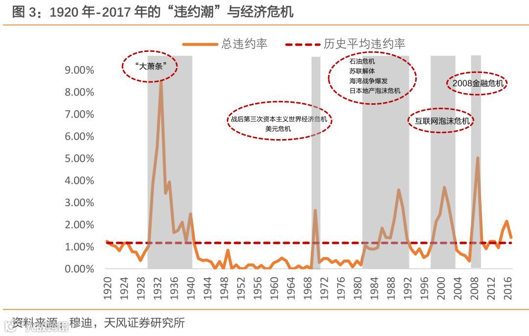 “违约潮”往往爆发于重大经济危机发生之时,其发生时间与历史上几次重大的经济危机的时间高度吻合;