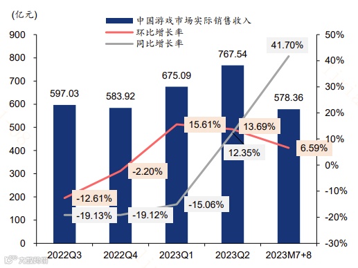 ► 游戏板块三季度业绩大幅回暖:据伽马数据,由于9月数据未出,2023年暑期档(7月+8月)我国游戏市场实际销售收入达578.36亿元,同比大增41.70%。其中客户端游戏表现相对平稳,移动游戏贡献增量大,未来“短剧+游戏”往移动端小程序转移趋势显著。2023年三季度,游戏板块实现营收220.53亿元,同比提升9.51%;实现归母净利润34.75亿元,同比提升36.39%,相较前几个季度显著回暖,AIGC降本增效逻辑取得阶段性验证。