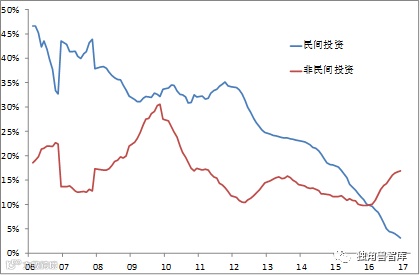 从投资的内部结构来看,由于制造业投资回落,故稳投资主要靠基建。2014-2016三年,中国制造业投资从13.5%降到4.2%,而基建投资增速则从2012年下半年至今一直处于较高位置,这几年更是维持在17%,这样才保持了经济的平稳。但基建投资高增长的代价,就是全社会杠杆率的快速上升。