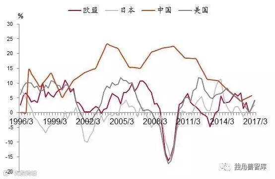 第一个维度是外部环境,即看全球经济和政治的变化。2017年,欧美日经济均处于复苏之中,但是一个弱复苏,虽然通胀预期都有所抬头,但总体不是太强,所以,这一轮的经济复苏比大家预期的要差一些。其中,美国经济走势相对好一些,2010年以来一直保持同比正增长。中国出口受益于全球经济复苏,摆脱了前两年的负增长局势。