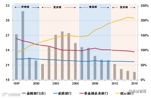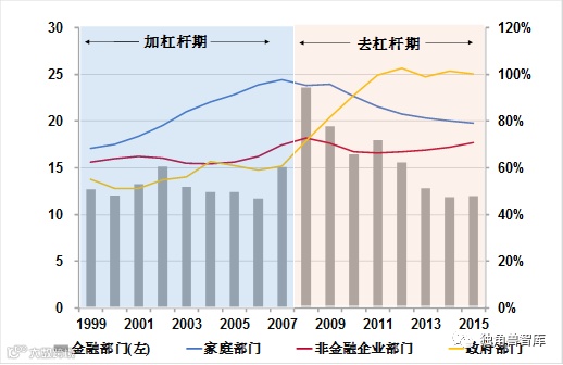 也正是为此,大家比较担忧政策层面加强金融监管的问题。但是由于稳增长的目标还在,监管也很难保持非常严厉,所以期待市场出清是不大可能的,对金融和房地产业的大幅缩减也会对经济带来很大的负面影响。美国和日本的案例也是一样,美国在次贷危机的时候确实出现了一定程度上的出清,但政府部门杠杆率有所上升,所以我们也只能寄希望于企业部门去杠杆,政府的杠杆不但很难去化,而且还将面临进一步的上升,金融监管要降低金融机构的杠杆率水平,否则金融风险的隐患会比较大。