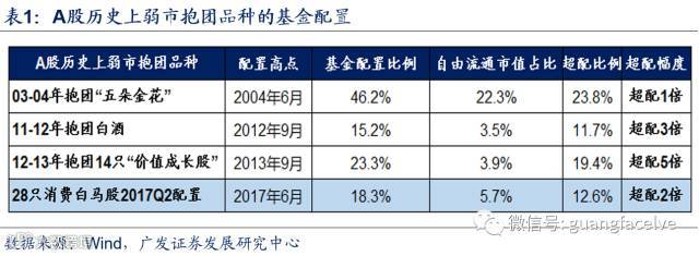 我们在此前曾详细分析过A股历史上三次“弱市”中的机构抱团行为,三轮结构性行情均伴随着基金持股比例的大幅提升,但从历史三次抱团尾声时机构筹码的超配比例来看,目前消费白马股的抱团集中度与其中两次相比还未到“极致”——