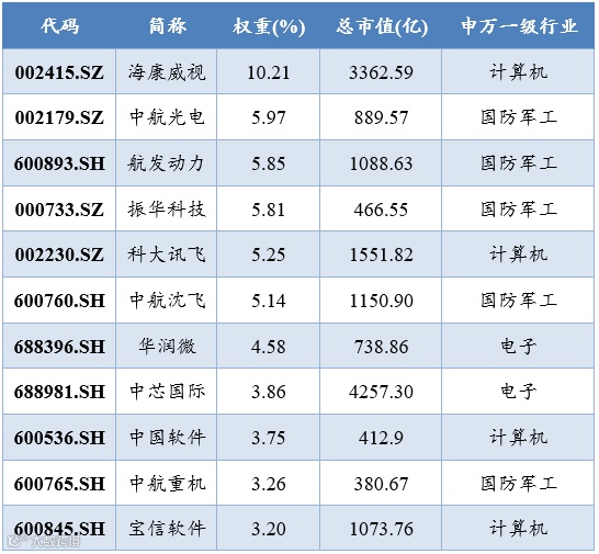 此外,该指数前十大权重股权重合计53.68%,涵盖了“国防安全”、“信息安全”等重点领域内的排头兵,包括千亿市值的行业龙头海康威视、“中国航空工业第一股”中航重机等重量级科技股。