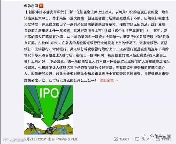 经济学家韩志国发表微博,并@中国政府网@新华社@人民日报@新浪财经@新浪证券,语气激烈地表示【 新股审批不能夹带私货 】,他说: