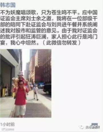 按道理说,刘士余作为证监会一把手,如此重要的饭局,应该让身边人做一份谈话纪要公布的,难道是让韩志国自己在微博上说?