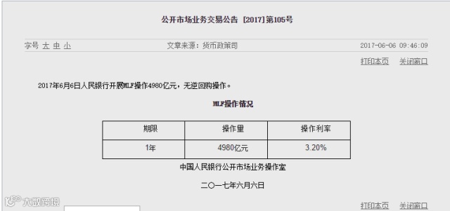 导读:6月美联储可能加息,6月份是继4、5月之后,又一个MLF到期高峰期,6月份又面临到银行体系MPA大考。2017年的6月,对于投资者来说值得高度警惕,因为这个月份极度危险。今天在央行的官网上挂出了一条重要利好信息:央行宣布开展MLF操作4980亿,品种为1年期MLF,利率和上一次持平,仍然保持在3.2%。此举可谓“加量不加价”。利好突袭,央行就这么放水了,央妈果然是亲妈!