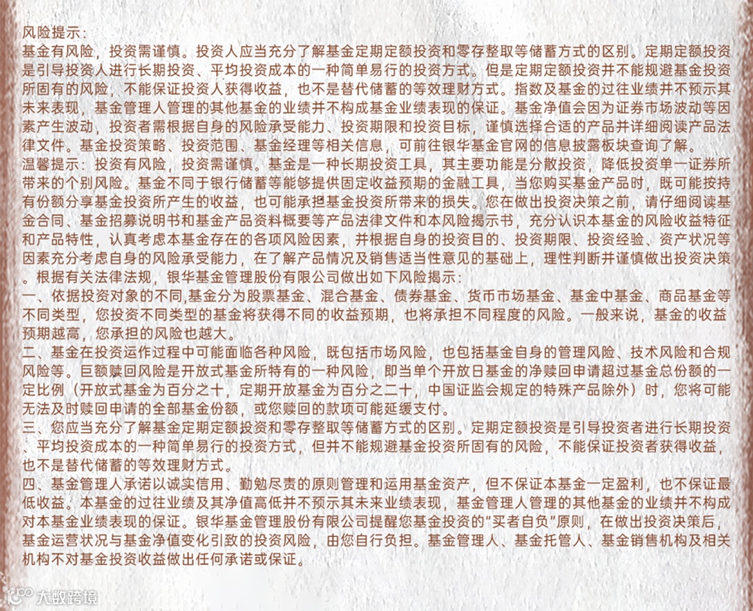 基金有风险,投资需谨慎。投资人应当充分了解基金定期定额投资和零存整取等储蓄方式的区别。定期定额投资是引导投资人进行长期投资、平均投资成本的一种简单易行的投资方式。但是定期定额投资并不能规避基金投资所固有的风险,不能保证投资人获得收益,也不是替代储蓄的等效理财方式。指数及基金的过往业绩并不预示其未来表现,基金管理人管理的其他基金的业绩并不构成基金业绩表现的保证。基金净值会因为证券市场波动等因素产生波动,投资者需根据自身的风险承受能力、投资期限和投资目标,谨慎选择合适的产品并详细阅读产品法律文件。基金投资策略、投资范围、基金经理等相关信息,可前往银华基金官网的信息披露板块查询了解。