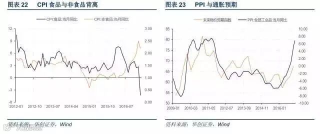 基于对需求判断,我们依旧认为2017年通胀中枢难以超越2016年,全年2%左右。通胀的潜在风险在哪?当前CPI和PPI的背离主要受食品和低端消费品拖累,后续PPI和房价预计都将处于高位,通胀预期也将随之上升,如果通胀预期最终影响到食品和低端消费品的价格运行,CPI和PPI的裂口将有可能通过食品价格的上涨来回补。我们认为这一潜在风险从四季度开始值得密切关注。