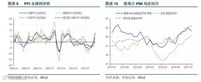 PPI主要是可贸易品,具有明显的全球同步性,,即使是饱受通缩困扰的日本,PPI的走势也和美、欧、日基本一致。2008年金融危机过后,全球工业生产都陷入供需失衡的格局,工业价格持续低迷,中国在2009年和2012年两轮强刺激的扰动下最为严重,即使是2013-2014年的全球反弹中也而没能浮出水面。本轮PPI的快速反弹,中国也非孤例,原油为代表的大宗价格反弹和2016四季度以来美日欧PMI持续回升,对全球PPI形成比较强的支撑。
