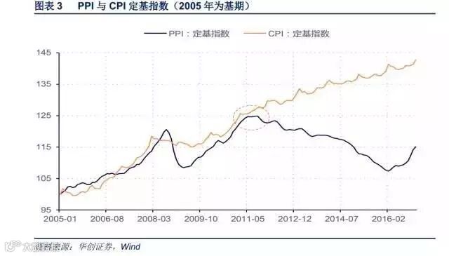 以2005年为基期,虽然经历2016年至今的急升,当前PPI定基指数不及2009年和2011年的峰值,相反一路走高的是CPI。从同比增速角度看到的PPI与CPI的巨大剪刀差,在定基指数下反而呈现相反的趋势,2016年2月份开始两者有收敛的迹象,但距离完全追赶CPI还需要进一步上涨。