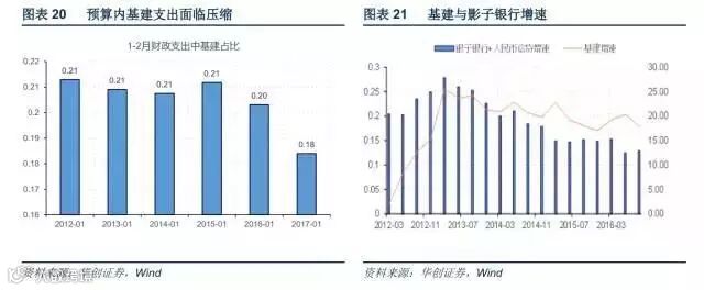 基建的春季躁动能否延续,制约因素来自影子银行体系是否还会进一步膨胀。1-2月财政支出中基建相关部分(交通运输、农林水、城乡社区事务)占比不及2012年至2015年同期水平,随着地方财政腾挪空间越发逼仄,预算内基建支出正在被压缩,当前基建的躁动主要依赖PPP来破局。由于PPP对民间资本的吸引力有限,最终预算外资金仍旧主要来自金融体系,金融去杠杆下,影子银行扩张受限,基建的资金约束也将逐渐突显。