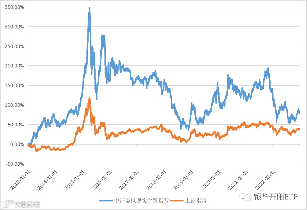 过去十年中证虚拟现实主题指数与上证指数走势对比