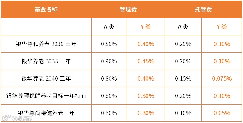以银华基金旗下5只增设Y类份额的养老目标基金为例,Y类份额的管理费、托管费均是在A类份额的基础上打了5折。