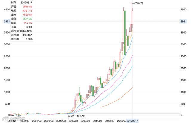 股价增长,4391/2.5=1756倍。第一次我们投入13.8万,那么这部分到2017年价值,9700万!(没看错,真实9700万)。