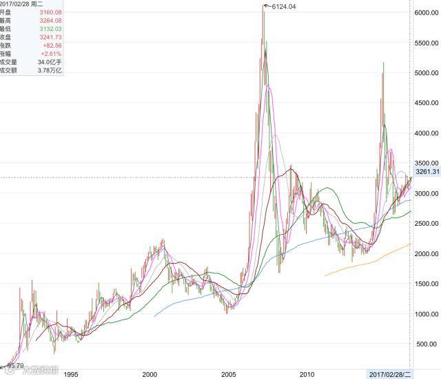 股市在1997年1月1日点位是1000点左右,截止到2017年3月17日,点位为3261,增长了3倍左右。如果一次性投入全部买房资金那么获得的收益和贷款买房差不多;如果按照分期买房的方式买股票,那么总体收益率是低于买房的,这是因为1997年基本上是近20年沪指的最低点位,因此后续的每一年定投收益都低于最初1997年的投入。