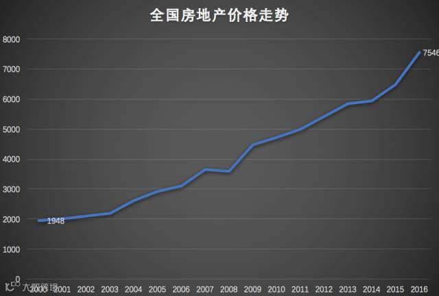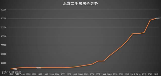 暴哥通过各种途径制作了一张北京二手房的价格走势,从1992年到2017年。可以看到,从1992年到2002年左右,北京的二手房价格几乎没有过大的增长,直到2005年开始房价才开始飙升。