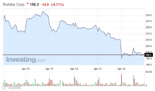 由于此次危机,东芝今年以来的股价也下跌了约29%,截至北京时间周五(4月14日)凌晨收盘报198.2日元,跌幅5.71%。