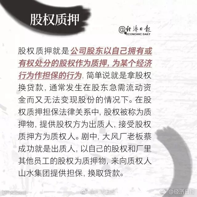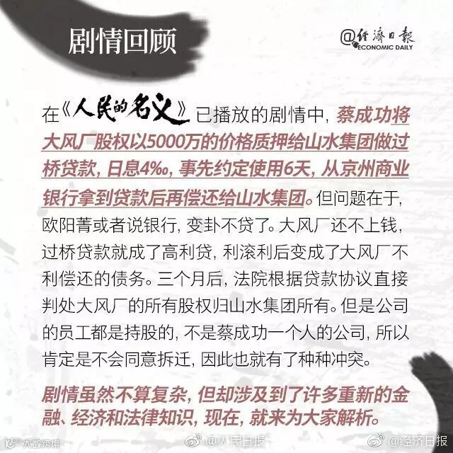 剧中,蔡成功将大风厂股权以5000万质押给山水集团做过桥贷款,日息4‰,约定使用6天,从京州商业银行拿到贷款后再偿还给山水集团。但事后银行变卦,大风厂还不上钱,股权要归山水集团所有……看热闹更看门道,这背后涉及到哪些金融知识?