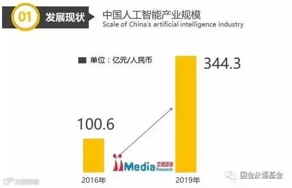 中国人工智能产业规模2016年已突破100亿,以43.3%的增长率达到了100.60亿元,预计2017年增长率将提高至51.2%,产业规模达到152.10亿元,并于2019年增长至344.30亿元。