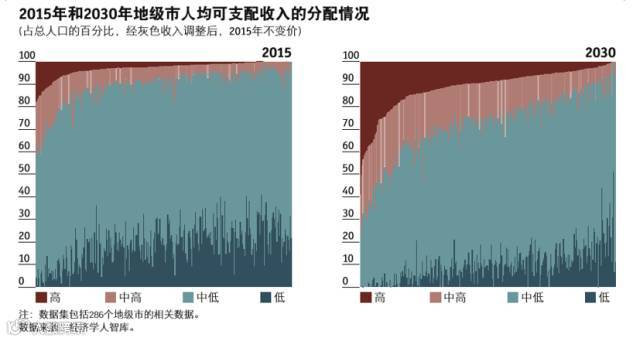 低线城市亦将“土豪”遍地。根据经济学人智库预测,到2030年中国地方资源不平衡的现象将得到有效缓解,工业与就业的转移将带来低线城市经济与居民收入的增长。其针对286个地级市的统计分析显示,到2030年,地级市的居民人口中,高收入的比例将大幅增加,地级市中的富裕城市将越来越多,中高收入人群的分布将保持扩大。