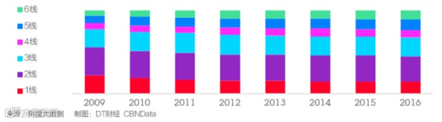 图:2009-2016双十一期间买家分城市级别购买人数占比